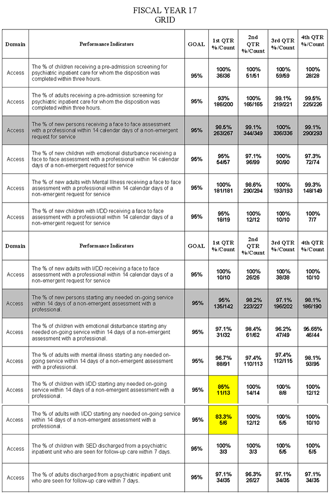 The State of Michigan uses the Michigan Mission Based Performance Indicator System (MMBPIS) to measure and hold accountable the Community Health Agencies’ effectiveness in providing timely, high quality treatment. This data is calculated based off of specific algorithms per state requirements. Each month, staff monitor and identify trends within the indicators to find outliers. Outliers are those data points that do not meet the state requirement for a specific indicator. Community Mental Health Service Providers (CMHSPs) are responsible for 6 indicators, from timeliness to treatment, to how many consumers are readmitted to inpatient facilities after discharge from services. The results of these indicators are reported to the state on a quarterly basis as shown below.